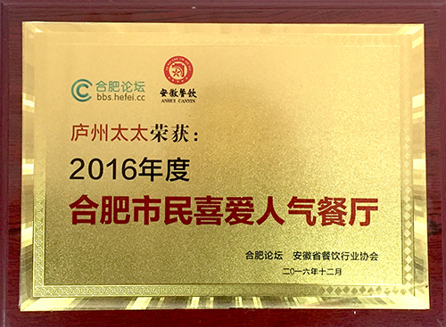 1月6日,合肥论坛与合肥餐饮协会主办的2016合肥餐饮行业峰会暨合肥第二届市民喜爱人气餐厅评选颁奖盛典于砂之船奥特莱斯成功举办。这次大会为众多餐饮同仁搭建了一个良好的交流平台,各位重量级嘉宾纷纷到场,分享自己从事餐饮行业的心得。庐州太太作为合肥本土老牌餐厅,一如既往受到广大群众的青睐,第二次摘得“合肥市民喜爱人气餐厅”的头衔。今后的日子里,我们会更加努力,不负大家这份厚爱!